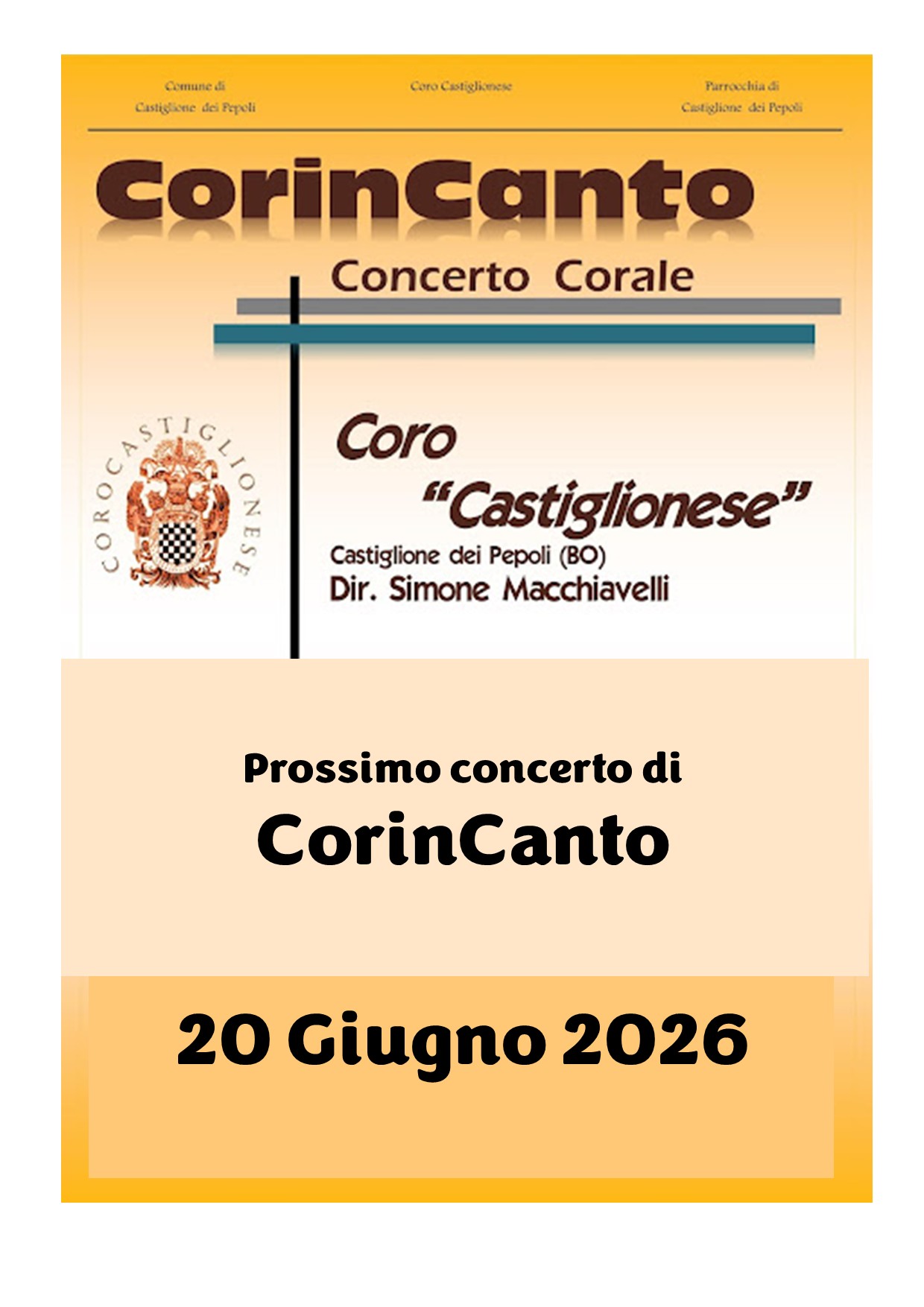 Benvenuti nella sezione dedicata agli eventi e ai concerti del CORO CASTIGLIONESE. Qui potrete scoprire le nostre esibizioni passate, rimanere aggiornati sui prossimi appuntamenti e conoscere come e quando portiamo la nostra passione per il canto popolare sui palchi di Castiglione dei Pepoli e oltre. Dalle calde serate estive alle magiche atmosfere natalizie, ogni concerto è un viaggio musicale che vi invitiamo a condividere con noi.